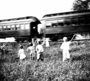 Children waving at the Northern Pacific train from St. Paul to Taylors Falls as it passes through Lindstrom.