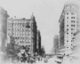 Hennepin Avenue at Sixth Street South looking toward Fifth, Minneapolis; Masonic Temple under construction at left next to the West Hotel