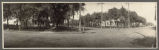 View of two story wood frame building housing the A. C. Grocery and A. C. Dairy Lunch, located at 1142 13th Street N. (University Drive North). The building has an awning over the front window, and an Oriel window on the second level. Five men are seated on the front steps of the building. Also visible is a horse-drawn wagon, parked in front on the muddy street. The Copper Kettle Inn is visible in the distant background. Numerous advertising signs on the building, including "Visit Our Sanitary Fountain, "Johnson's 'Velvet' Ice Cream", "Watkin's Goods For Sale Here" and "Pipe Repairing". A barber pole visible on the street corner. Sign affixed to utility pole pointing way to Harwood and Argusville.